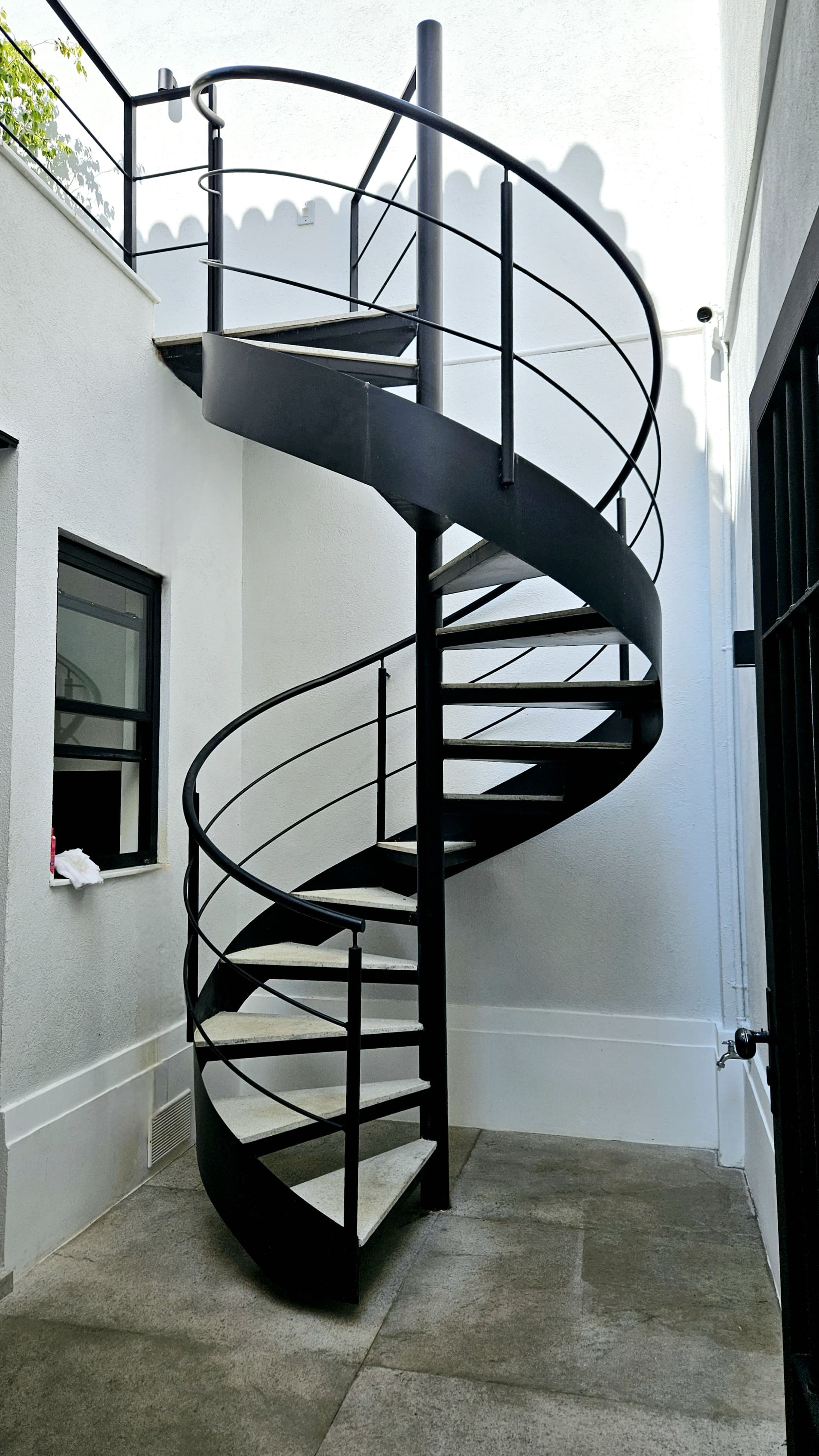 • Escada caracol. Estrutura central de tubo de 4" em aço carbono. Diâmetro 1.8 metros. Degraus de mármore. Fechamento  do lateral externo dos degraus em chapa de aço carbono 1,5 mm de espessura.